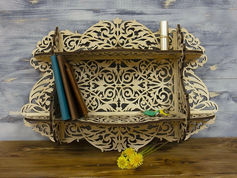 Для изготовления данной полочки мы выбрали фанеру оптимальной толщины - 6мм. С помощью лазерной резки выполнили узор. Таким же образом можно нанести гравировку. Сама по себе она имеет сборно-разборную конструкцию, что очень удобно при перемещении на дальние расстояния. Точно такую же резную полку можно сделать из дерева, которое должно быть ровным и не больше 10 мм.